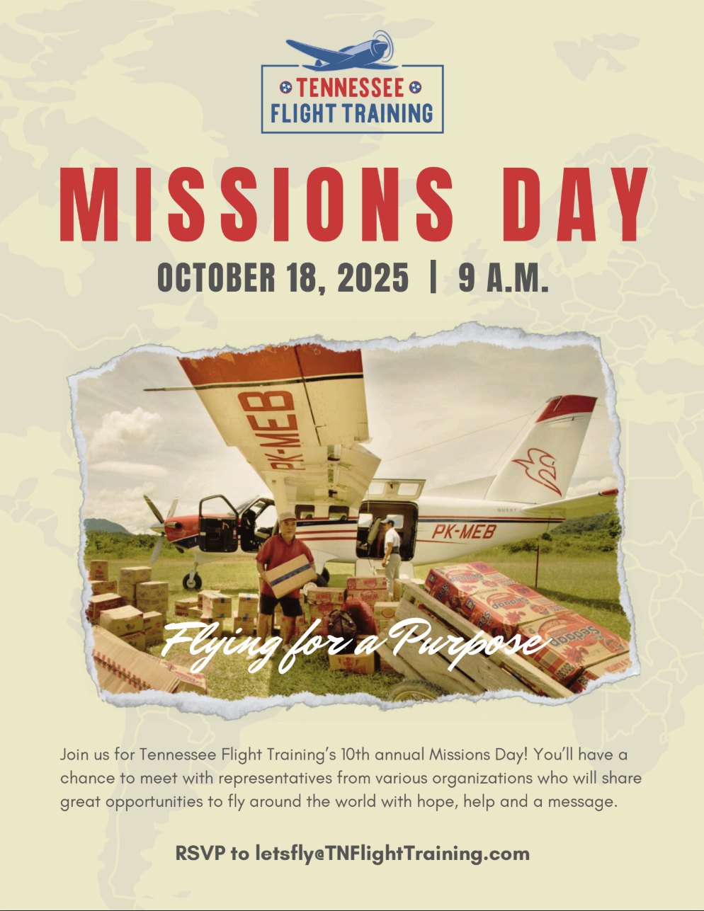 Join us for Tennessee Flight Training’s 10th annual Missions Day! You’ll have a chance to meet with representatives from various organizations who will share great opportunities to fly around the world with hope, help and a message.
